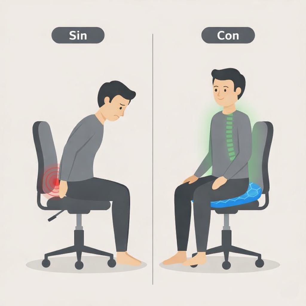 Pasas horas sentado y el dolor aparece: presión en el coxis, espalda rígida y piernas dormidas. Te mueves, pero no mejora.